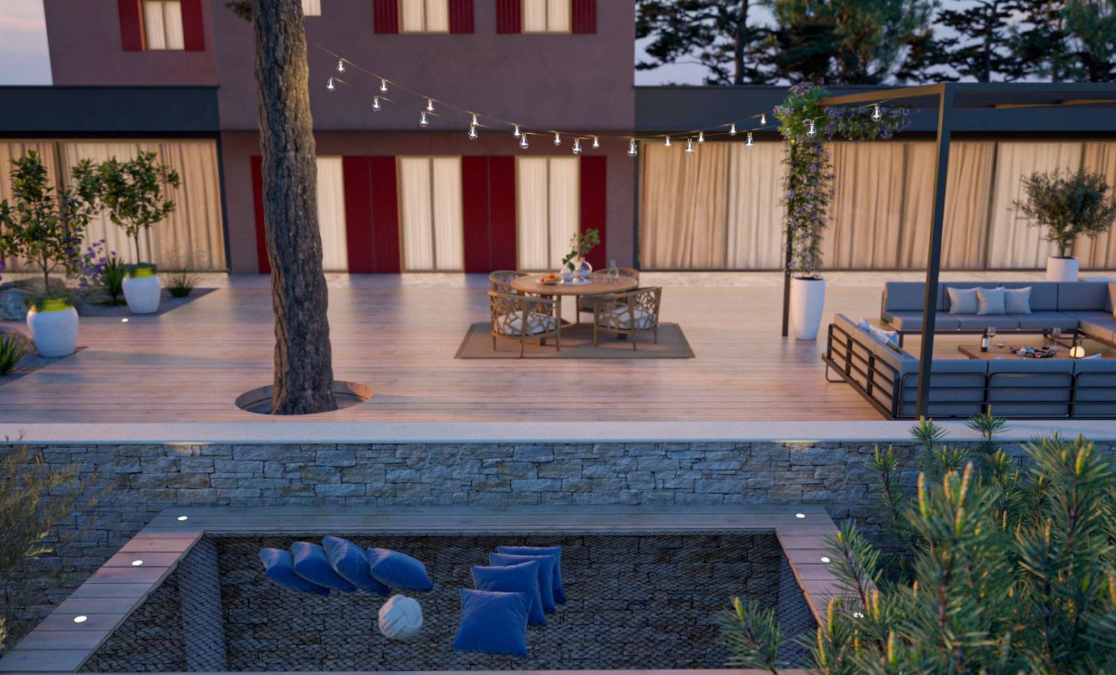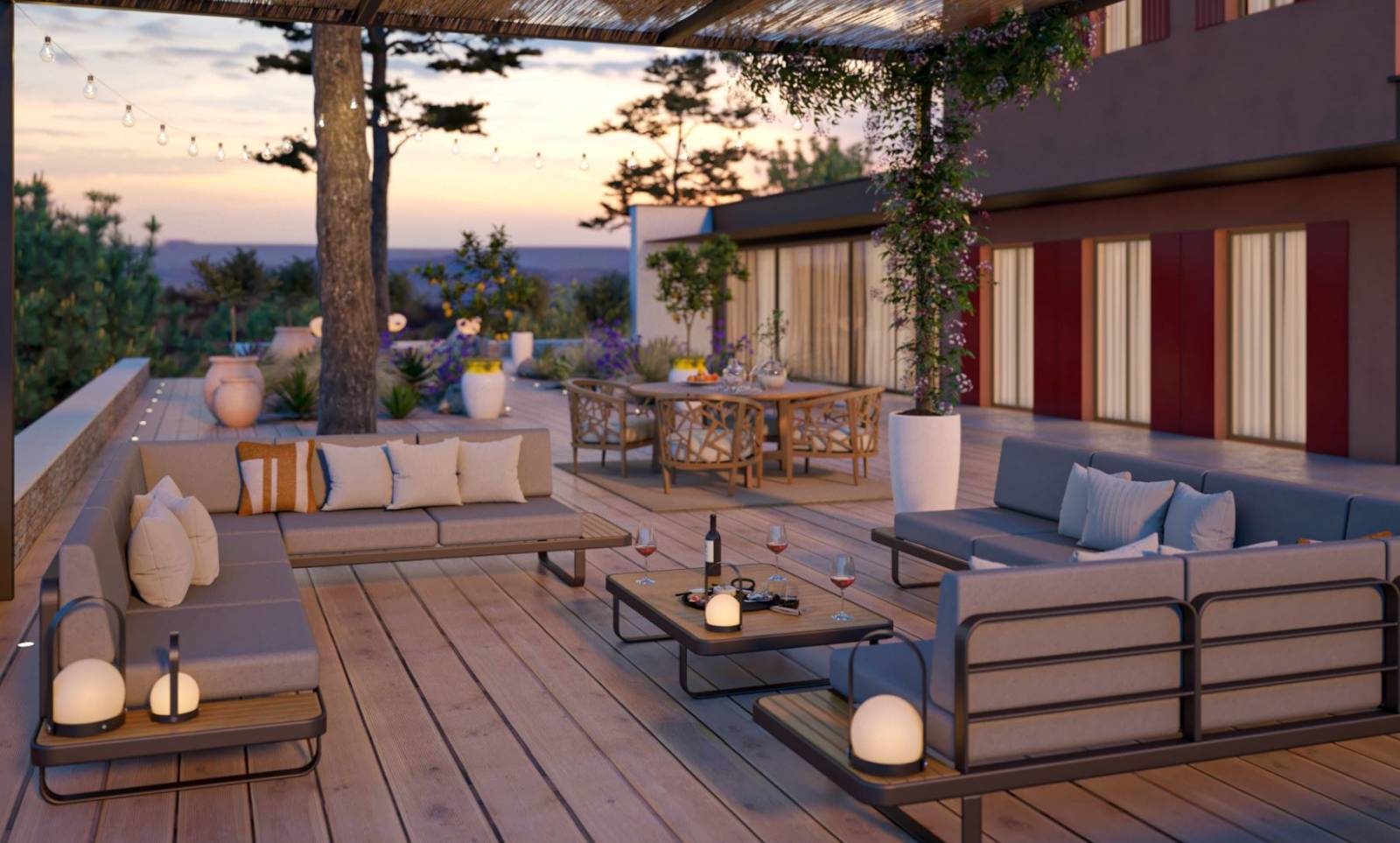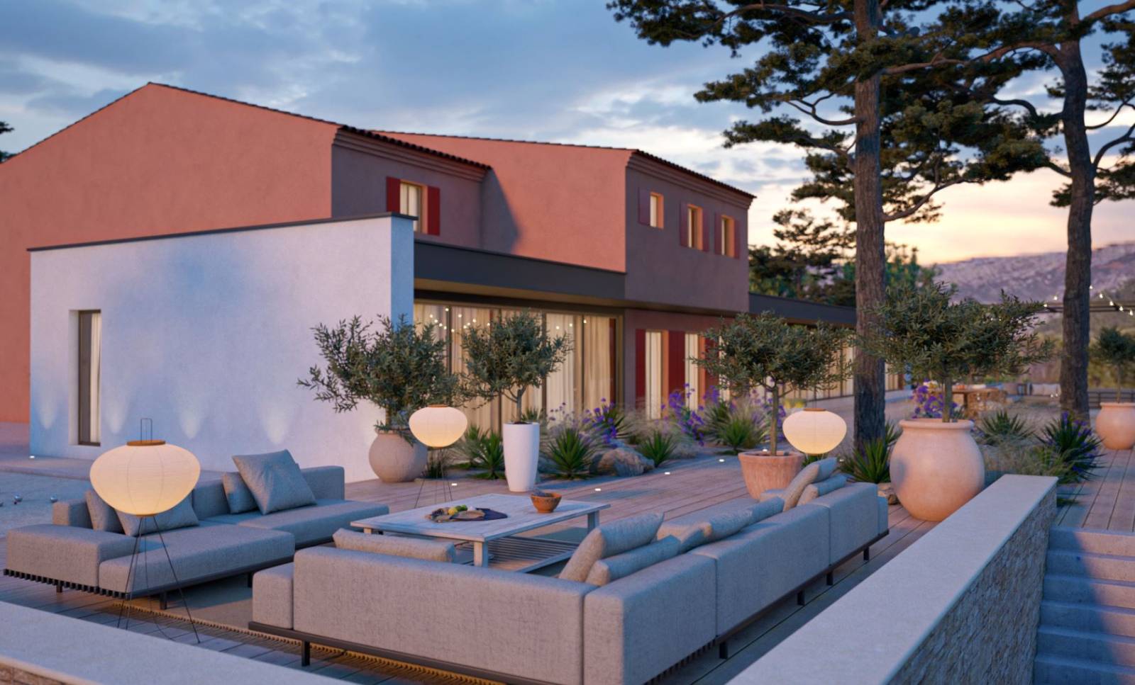Non loin de là, un coin salon a été aménagé pour permettre de profiter pleinement de la vue sur la Sainte-Baume. Ce salon extérieur, confortable et moderne, est composé de canapés et de fauteuils en matériaux naturels créant une ambiance à la fois chaleureuse et élégante. L’espace est complété par une table en bois, idéale pour les repas en extérieur ou les moments conviviaux, tout en étant enveloppé par la beauté sauvage du paysage environnant. Grâce à un éclairage doux et discret, ce coin salon devient également un lieu idéal pour apprécier les soirées en pleine nature.