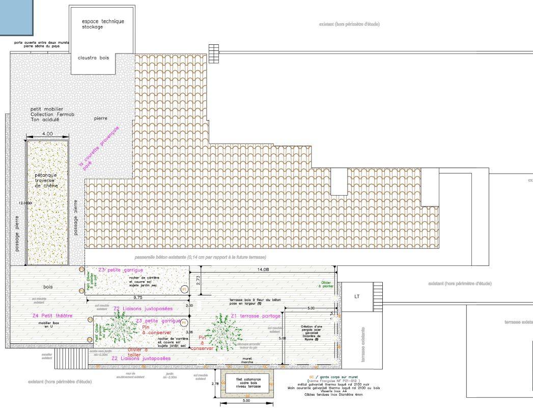 Le client souhaitait profiter de ce cadre naturel unique tout en créant un jardin qui lui permette de se ressourcer et de passer du temps de qualité avec ses proches. L’un des éléments les plus spectaculaires du projet est l’installation d’un coin sur un filet flottant, suspendu offrant une expérience inédite. Ce filet suspendu permet de s’allonger ou de se détendre tout en ayant une vue panoramique à couper le souffle sur la Sainte-Victoire, créant une sensation de flottement au-dessus de la nature environnante. C’est un véritable point de vue, propice à la méditation, à la lecture ou simplement à l’évasion, tout en étant bercé par le vent et la lumière du soleil.
